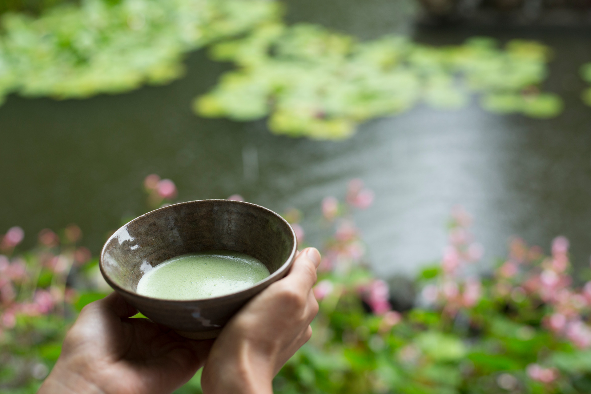古い木造建築や、庭園の石、苔、木々の葉、花。